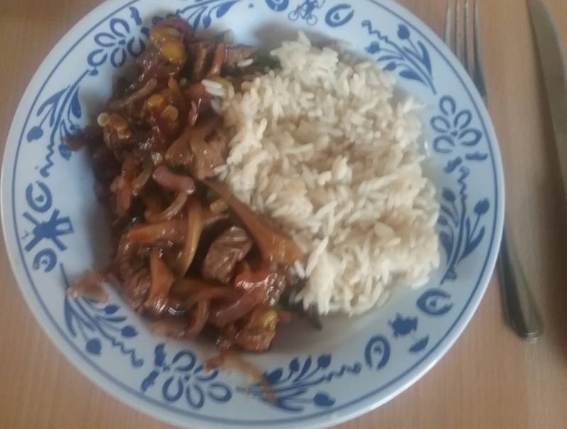 fruit een teentje knoflook en wat rode ui aan in een wok met wok olie. doe hier het rundvlees bij, voeg peper toe op smaak.