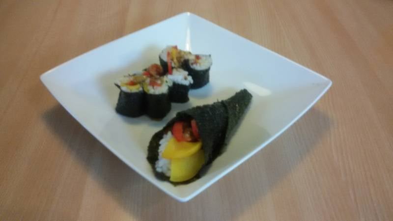 sushi puntzakje met zoetzure rijst, rivierkreeftjes gebakken in ketjap met ui, bruine basterdsuiker en kokosrasp, nog wat paprika en perzik en klaar, de perfecte temaki (zie foto, er staan ook nog wat gewone maki hapjes op)